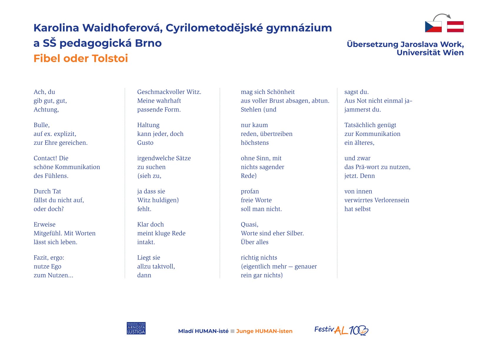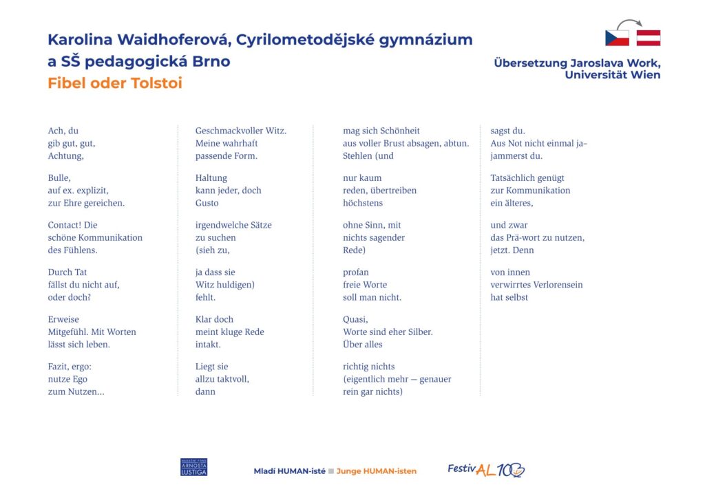 Naše škola má důvod k radosti – Karolina Waidhoferová obsadila za svou báseň Slabikář či Tolstoj 2. místo v literární soutěži Mladí HUMAN-isté!
